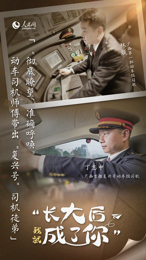 2020年12月底,广西首次配属5组CR300AF新型复兴号动车组,服务壮乡2021年春运。丁志中和师傅林斌从中车浦镇公司接回CR300AF型复兴号动车组,历经17个小时的飞驰,跨越4个省市,CR300AF型“复兴号”动车组终于在广西落户。