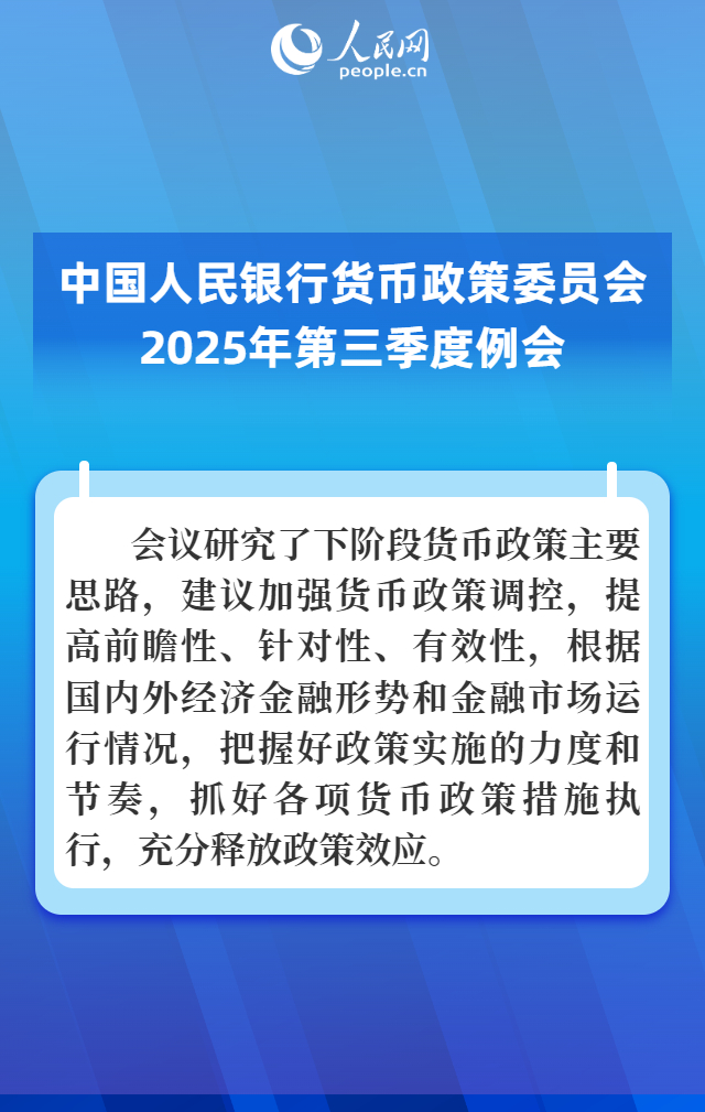 人民网北京9月28日电 (记者罗知之)据中国人民银行网站消息,中国人民银行货币政策委员会2025年第三季度例会近日召开,会议研究了下阶段货币政策主要思路,建议加强货币政策调控,提高前瞻性、针对性、有效性,根据国内外经济金融形势和金融市场运行情况,把握好政策实施的力度和节奏,抓好各项货币政策措施执行,充分释放政策效应。