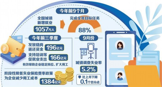 人力资源社会保障部最新数据显示,今年前9个月,全国城镇新增就业1057万人,完成全年目标任务的88%;9月份城镇调查失业率5.2%,环比下降0.1个百分点。