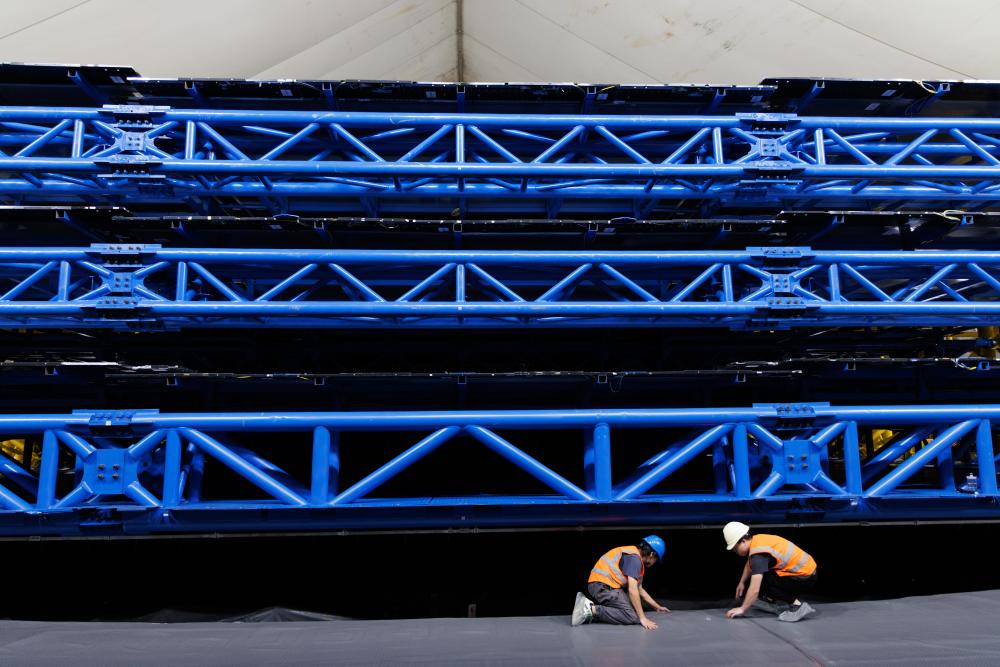 11月18日,工人们正在江门中微子实验大厅铺设地垫,其顶上三层是缪子探测装置。新华社记者 金立旺 摄