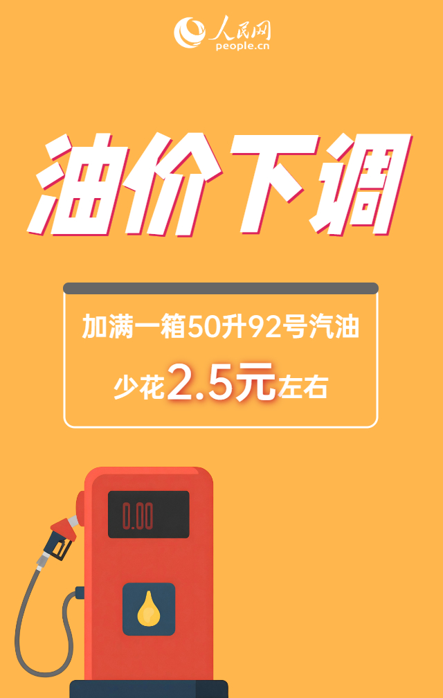 人民网北京11月24日电 (记者罗知之)据国家发展改革委网站消息,近期国际市场油价波动运行,根据11月24日的前10个工作日平均价格与上次调价前10个工作日平均价格对比情况,按照现行成品油价格机制,自11月24日24时起,国内汽、柴油价格(标准品,下同)每吨分别降低70元和65元。按此计算,加满一箱50升的92号汽油,将少花2.5元左右。
