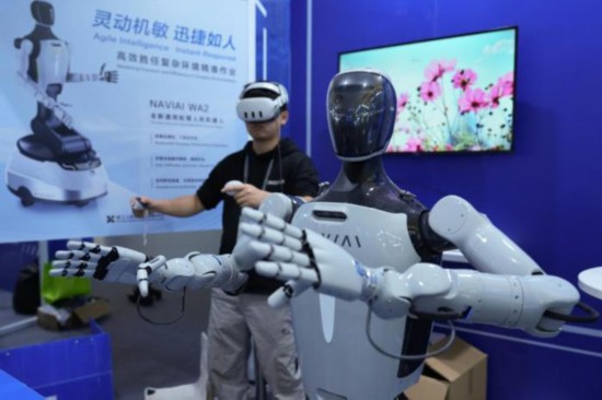 11月6日,在2025年世界互联网大会“互联网之光”博览会现场,一家企业工作人员展示人形机器人同步模仿精细动作。新华社记者 黄宗治 摄