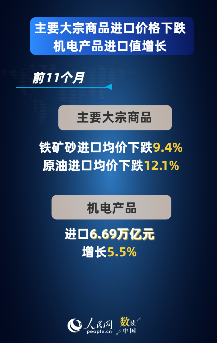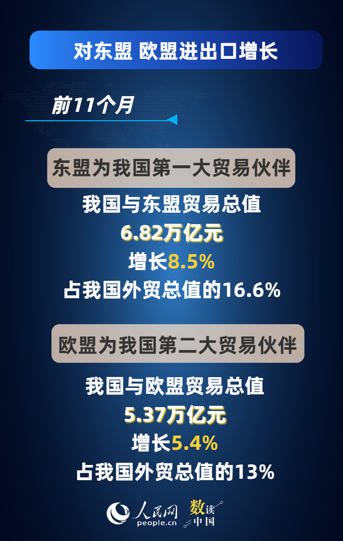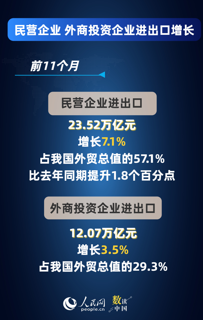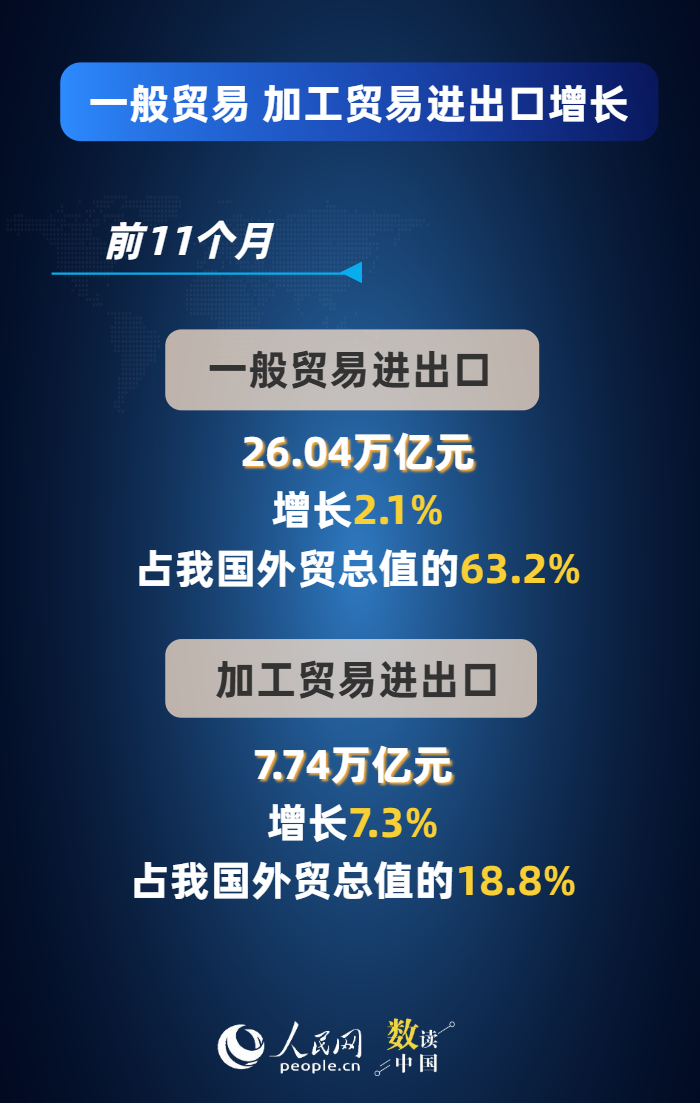 今年以来,我国促进外贸稳定增长的政策不断落地落实,外贸便利化水平持续提升,广大外贸企业积极应变、锐意进取,外贸韧性活力持续彰显。最新数据显示,前11个月,我国货物贸易进出口总值41.21万亿元人民币,同比增长3.6%,主要呈现以下特点——