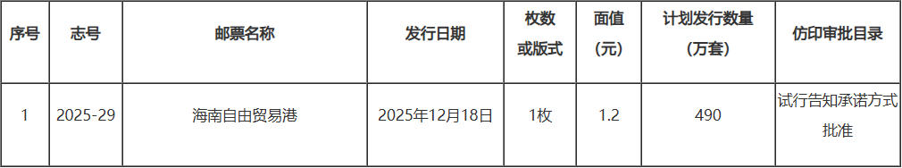 《海南自由贸易港》特种邮票计划发行数量及仿印审批目录公布