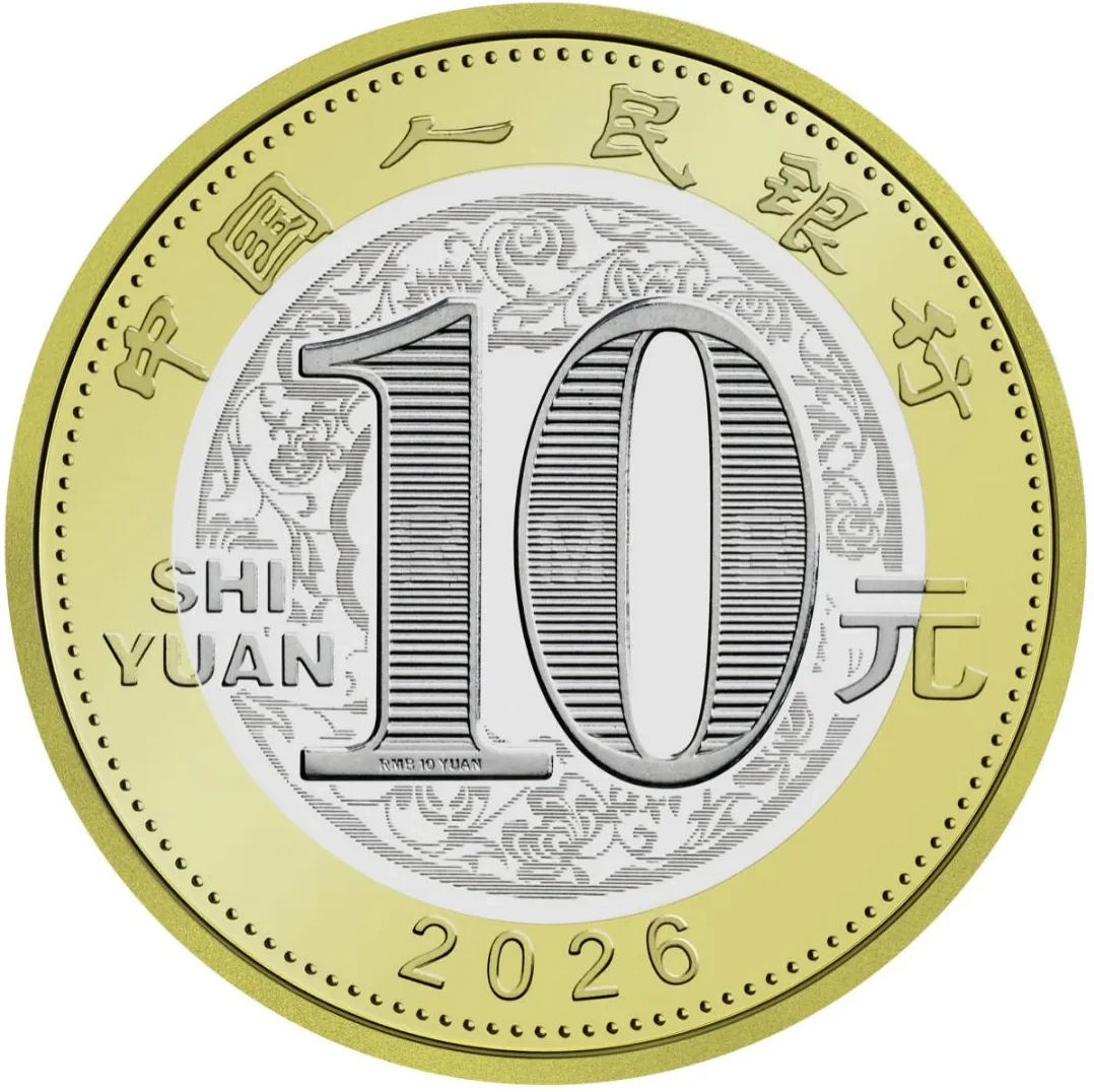 据介绍,双色铜合金纪念币正面图案为“中国人民银行”、“10元”字样,汉语拼音字母“SHIYUAN”及年号“2026”,底纹衬以团花图案。