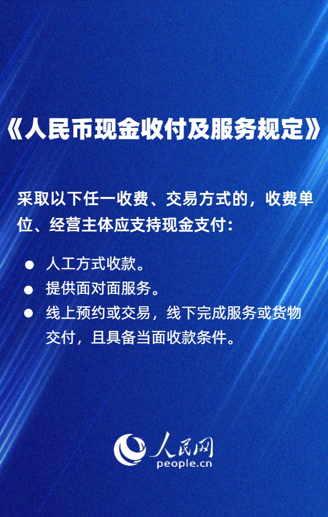 《规定》明确,采取以下任一收费、交易方式的,收费单位、经营主体应支持现金支付:人工方式收款;提供面对面服务;线上预约或交易,线下完成服务或货物交付,且具备当面收款条件。