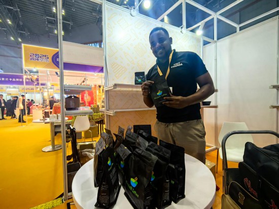 卢旺达咖啡商穆兰巴正在展会现场为咖啡豆产品“补货”。新华社记者周蕊 摄
