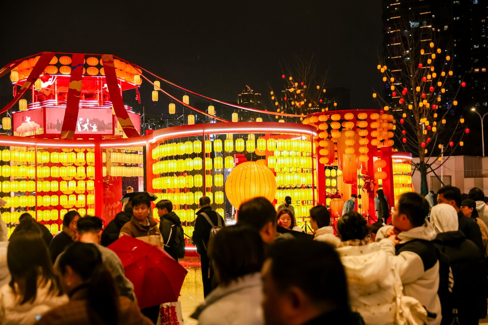 走进江宸天街外广场,500平方米的祥云灯笼矩阵璀璨夺目,楚文化凤鸟纹、瑞兽纹在光影中流转生辉,8米高的巨型跨年装置巍然矗立,成为市民争相打卡的跨年新地标。
