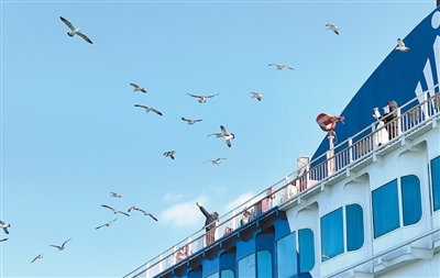 山东省烟台市,乘船前往大连的旅客在甲板上喂海鸥。 |