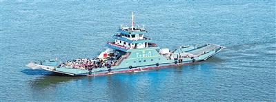 安徽省铜陵市,搭载乘客和车辆的轮渡前往位于长江江心洲的义安区老洲乡。 |