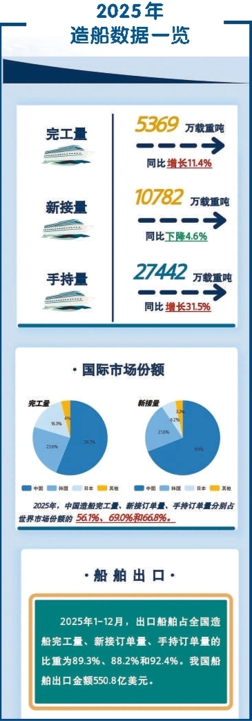 “国际船东明显回流中国市场。”中国船舶工业行业协会副会长李彦庆告诉记者,数据显示,2025年,我国出口船舶分别占全国造船完工量、新接订单量和手持订单量的89.6%、89.5%和93.2%。这意味着,中国每建造10艘船,就有近9艘将服务于全球航运市场。