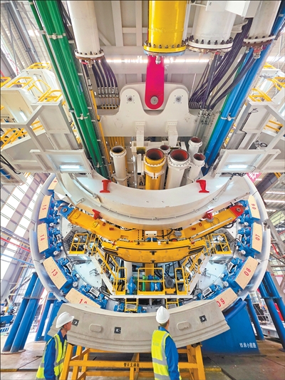 该隧道在国内高铁盾构隧道建设中,首次创新采用承插式管片结构。该结构借鉴古代榫卯工艺,搭配可移动快速连接接头,采用纵向对缝拼装方式,让管片拼装一次性顶推到位,省去传统工法中手孔封堵、螺栓复紧等工序,在结构性能、防水性能等方面优势更为突出。“奋楫号”盾构机整机全长145米,总重约3800吨,刀盘开挖直径14.33米,搭载了多项智能化装置,将实现拼装效率与结构精度的双重提升。