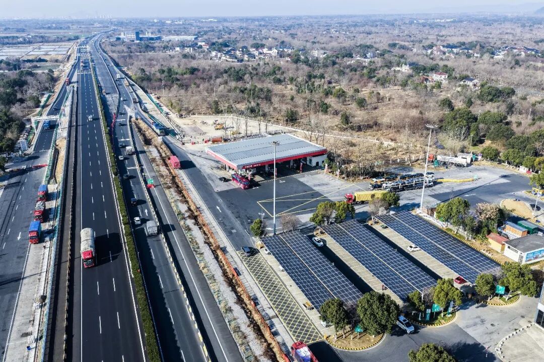 G50沪渝高速长兴服务区内的太阳能光伏板下是升级完成的高速服务区充电站(2026年1月7日摄,无人机照片)。新华社记者徐昱摄