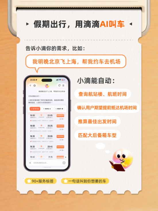 假期出行常见异地辗转、携老扶幼等场景,个性化叫车需求增多,不少人选择把它们交给滴滴AI叫车——一句话描述需求,就能定制适合自己的车。小滴多个服务标签适配不同出行需求;接送机、接送站场景下,只需告知大致出发时间和城市或班次,小滴便可自动查询信息、定位航站楼/火车站,推算最优叫车时间,并匹配后备箱空间较大的车型,贴心又省力。