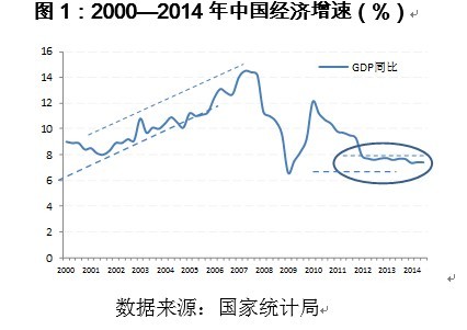数据分析显示,2002-2007年中国经济增速一直保持在上升通道,时间长达24个季度。但随着国际金融危机带来国际经济环境的剧烈变动,中国GDP增长在2008-2011年间也经历了较大波动,从2007年四季度的14.2%快速下降到2009年一季度的6.6%,随后因大规模刺激政策回升到2010年一季度的12.1%,之后开始继续下降到2012年一季度的8%以下,这16个季度基本的趋势是在剧烈波动中经济增速下行。但从2012年一季度至2014年三季度,GDP增速已连续11个季度保持在7-8%的区间之内,中国经济增速的轨道已发生明显转换,从连续上升、大幅波动进入较为稳定的中高速增长区间(见图1)。