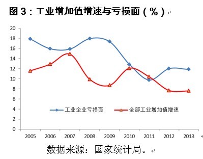 其次,企业盈利并未随GDP增速下降出现大面积亏损,微观经济基础变得更加坚实。一般而言,工业增加值增速与工业企业亏损面呈显著反向变动关系。近年来,随着产业结构调整与升级步伐加快、企业抗风险能力增强,企业亏损面并没有随着经济增速下降、工业增加值增速下滑而出现明显上扬,企业盈利趋于稳定。2009年,GDP同比增长9.2%,全部工业增加值同比增长8.7%,工业企业亏损面达17%以上。2012年以来,随着GDP、工业增加值增长速度的回落,工业企业亏损面并没有上升,反而呈现下降之势。2012年GDP同比增长7.7%,全部工业增加值同比增长7.7%,工业企业亏损面下降为12.02%,2013年GDP同比增长7.7%,全部工业增加值同比增长下滑至7.6%,而工业企业亏损面进一步下降至11.87%(见图3)。