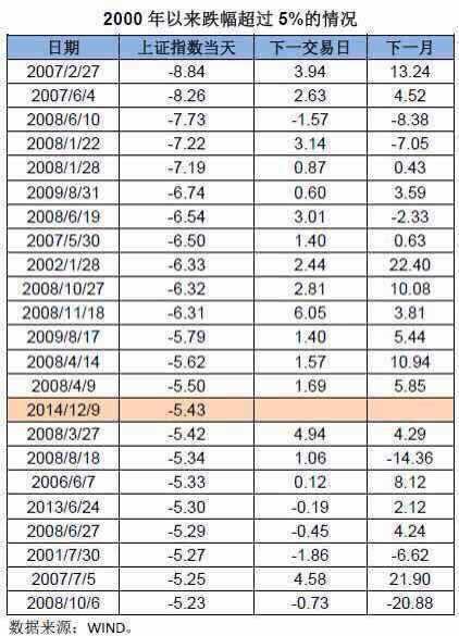 从统计数据上看,2000年以来共有23个交易日沪指跌幅超过5%,在暴跌发生的第二天沪指多有不同程度的反弹,仅有5次是延续了前一天的跌势。