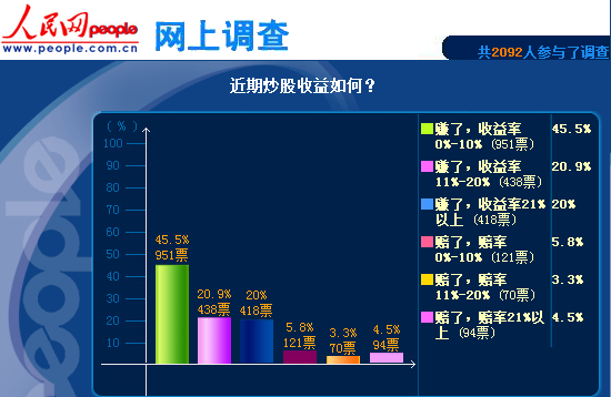 到目前为止共有两千多股民参与调查。其中有近7成股民称对股市有信心,并看好股市后续发展;8成股民称自己在近期炒股中赚了,其中有一半股民收益率在10%以上;很大一部分股民承认面对股市突然的 “大变脸”开始恐慌,认为需要救市,但近更多的股民相信市场能自行调节。